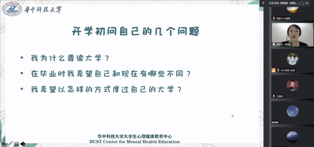 2022年10月13日晚19:30,开云kaiyun体育马克思主义学院组织2021级全体研究生观看大学生心理健康讲座。此次讲座是由华中科技大学心理健康教育中心副主任、专职咨询师、中国心理学会注册心理师郭晓丽主讲,以线上讲座的形式为大家带来本年度秋季成长大讲堂第一场《大学新生心理适应》。