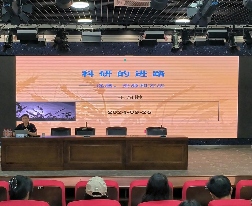 9月25日下午,安徽师范大学马克思主义学院二级教授,思想政治教育专业博士点负责人、博士生导师王习胜教授应邀来到马克思主义学院,在云塘校区文科楼B300报告厅为我院师生带来了主题为“科研的进路——选题、资源和方法”的学术讲座。此次讲座由张明海院长主持,教授委员会主任余乃忠教授、副主任艾楚君教授等学院师生近100人到场聆听。