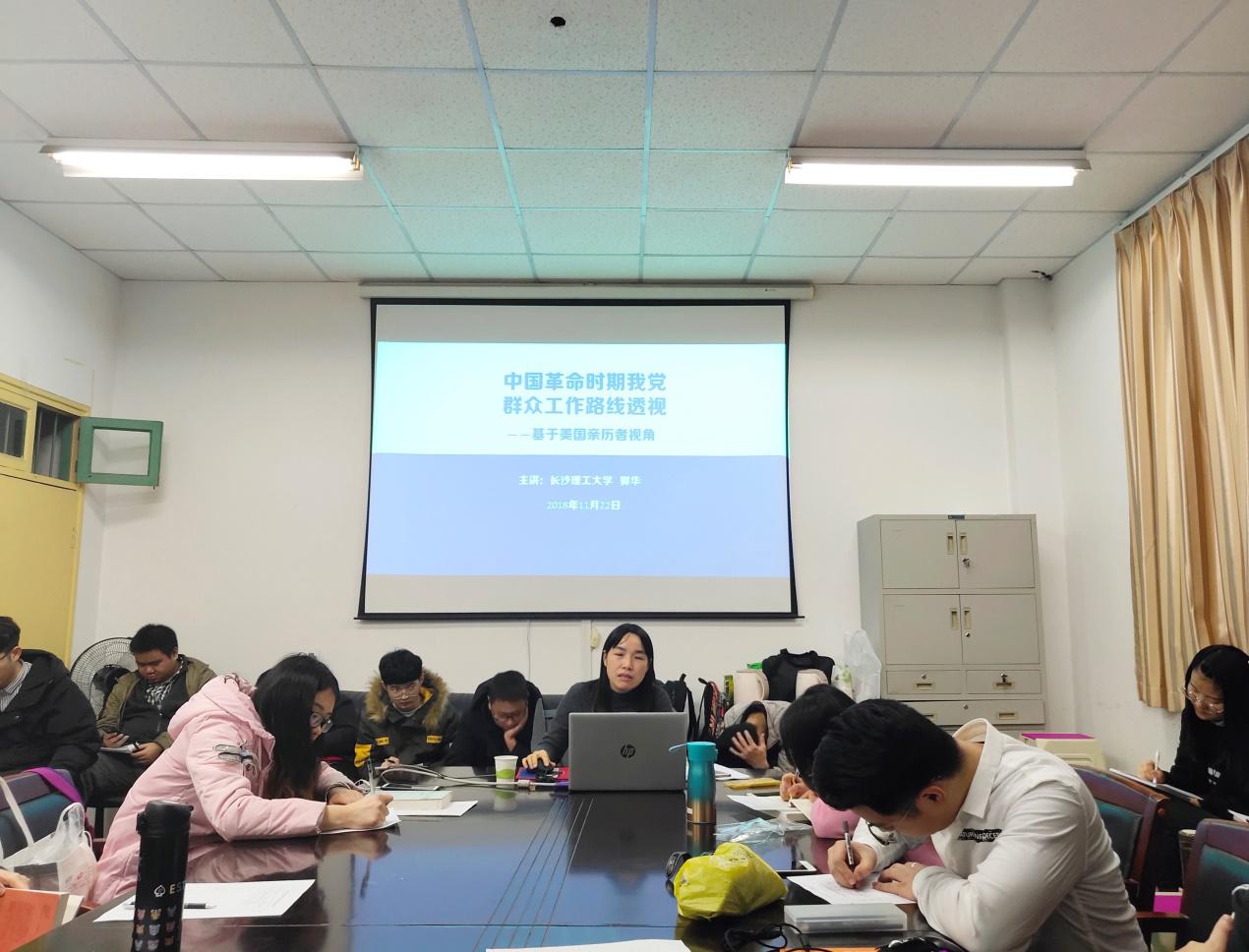 2018年11月22日晚七点半,开云kaiyun体育马克思主义学院郭华老师在金盆岭校区四教503会议室为全院2018级研究生带来了一场题为“中国革命时期我党群众工作路线透视”的专题讲座。