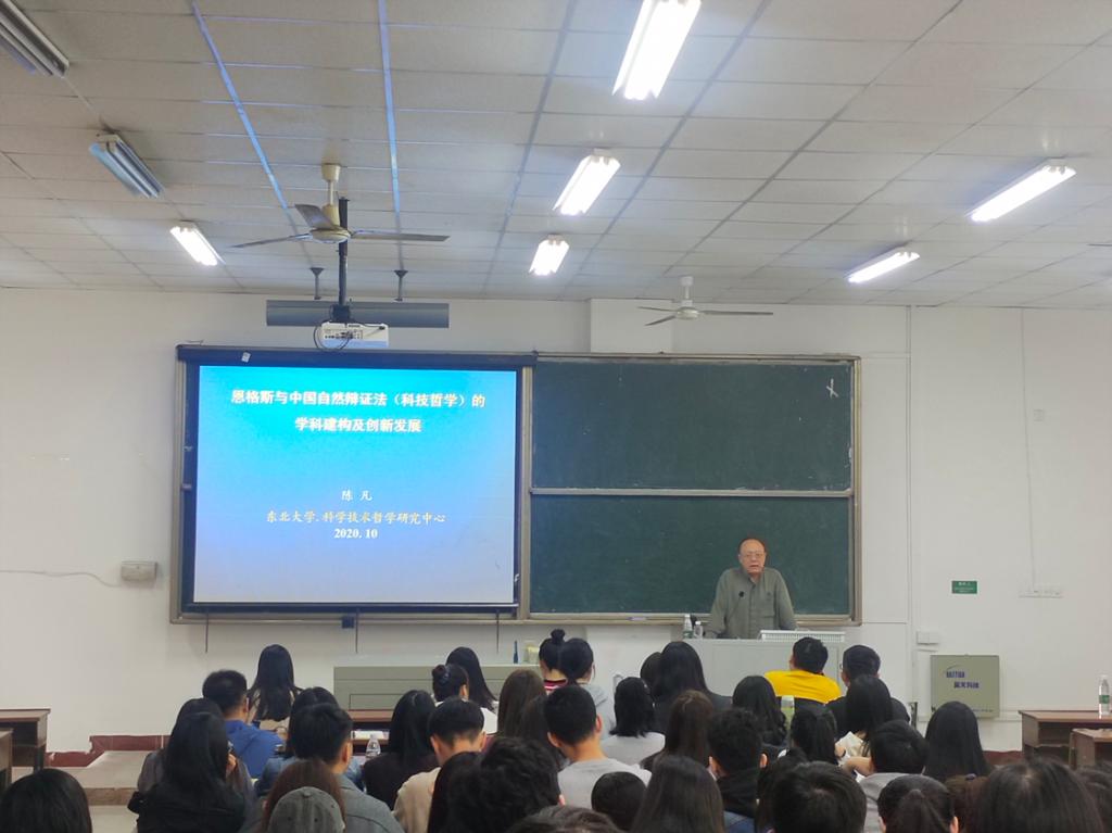 10月31日上午9点,东北大学博士生导师陈凡教授应马克思主义学院邀请,在开云官网金盆岭校区4教109作了题为《恩格斯与中国自然辨证法(科技哲学)的学科建构及创新发展》的学术讲座,讲座由我院院长陈万球主持,李雨燕副院长、院学科办文贵全主任、廖苗副教授、刘佳男博士等我院教师,学院2020级全体研究生听取了讲座。