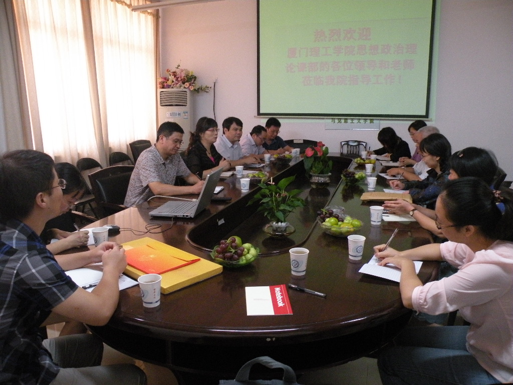 交流会在文科楼B601院会议室举行。周艳红书记首先对兄弟院校领导与同行的到来表示欢迎,并简要地介绍了我院办学的历史和现状。陈万求副院长着重介绍了我院近几年来科研发展的状况和取得的成果,易显飞副院长从思想政治理论课无纸化考试改革、实践教学、学科建设、师资培养等角度介绍了我院的教学情况。厦门理工学院同行们对我院科研和教学方面取得的成果给出了高度评价,尤其对我院进行的教学和考试改革倍感兴趣,并表示要继续交流和充分借鉴。