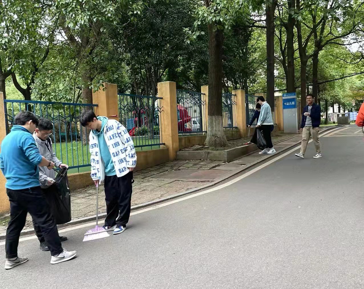 实践活动的各组同学在组长的带领下拿起了扫把、簸箕、铁钳、垃圾袋和一次性手套等清扫工具,分别打扫了校门东门至校训石(包含体育馆门口的小空地)、校训石至办公大楼(包含9教、10教两条小路及办公大楼门前空地)、办公大楼至幼儿园(指校史馆与办公楼之间的小路,一直到东苑教职工食堂与幼儿园门前空地)的落叶、烟蒂等零碎垃圾,并劝阻违规停车现象。参与本次活动的李卓群同学说:“欧文先生曾说过这样子一句话——完善的新人应该是在劳动中和为了劳动而培养起来的,恰是这次实践活动,让我对这句话有了更真切与深入的理解。”