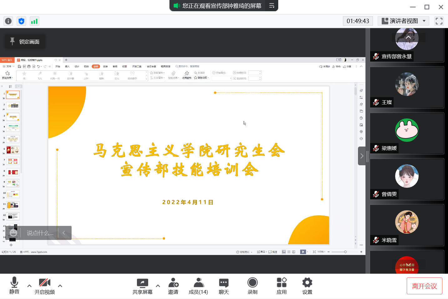 2022年4月11日晚七点,马克思主义学院研究生会宣传部通过腾讯会议线上视频为部门进行技能培训会议。会议由宣传部部长钟雅琦负责主持,辅导员曾蓓老师以及宣传部全体成员参加了此次会议。