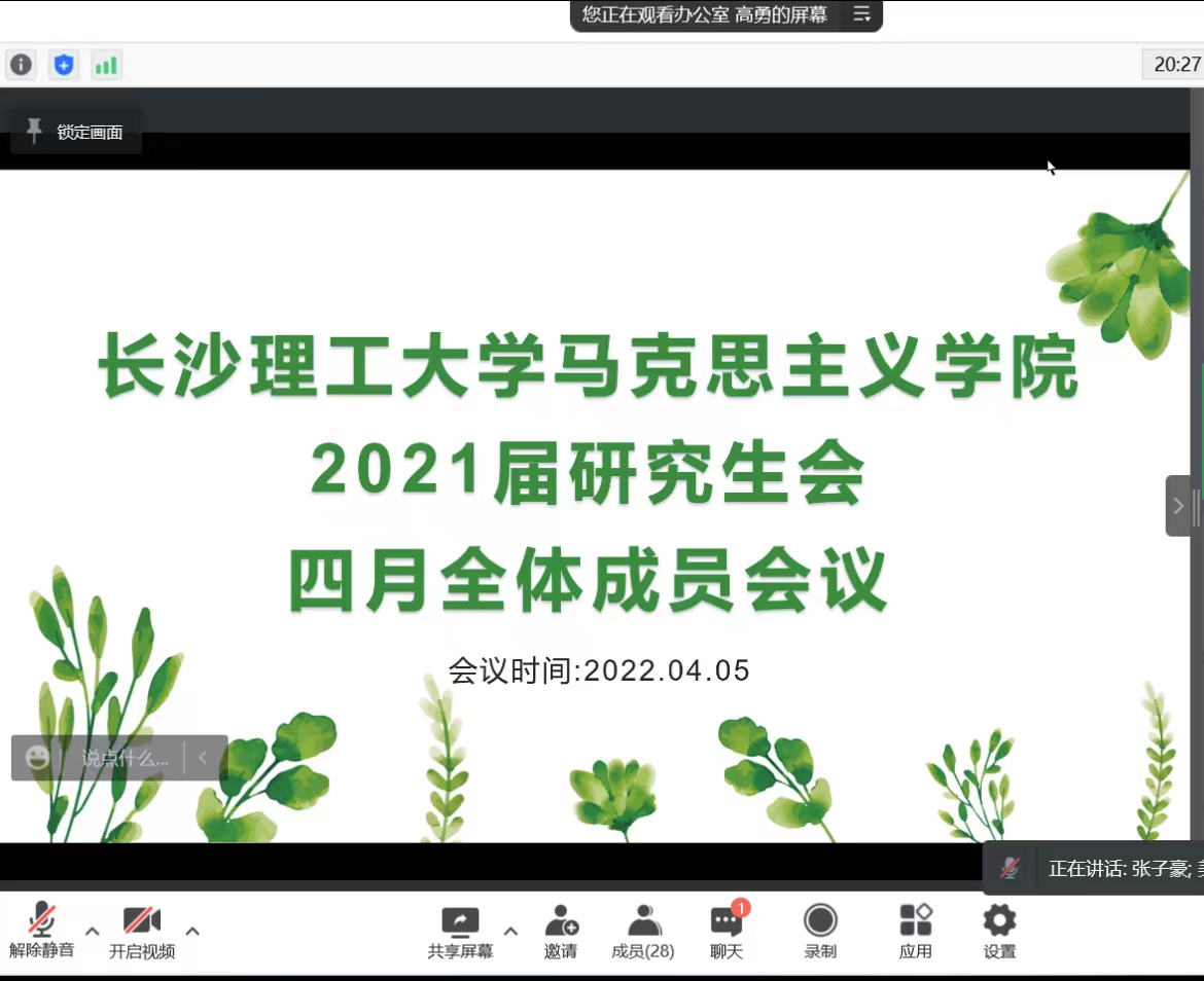 2022年4月5日晚八点,我院召开研究生会四月全体成员线上会议。会议由研会办公室高瑞瑞同学主持,辅导员曾蓓老师以及院研会全体成员参加了本次会议。