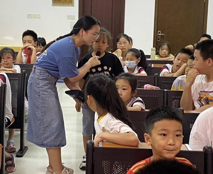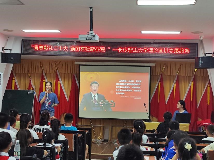 第一场由张卉洁、李英祯同学共同完成《牢记“红船精神”,不忘时代使命》主题宣讲。1921年在嘉兴南湖的小船上发生了什么开天辟地的大事件呢?这艘中国共产党的“产床”为什么要叫做“红船”呢?“红船”之“红”的深刻意义是什么呢?张卉洁同学以一个个新颖别致的问题激发了学生们的求知欲望。“图文+音频”的宣讲方式让现场的小学生理解了红船精神的深刻内涵。接着,李英祯同学带领孩子们学习了黄大年、张桂梅等时代楷模的感人事迹。相关音频的播放让小学生们更为深刻的领悟到作为祖国新一代的年轻力量,要继承与弘扬伟大的革命精神之源——“红船精神”。
