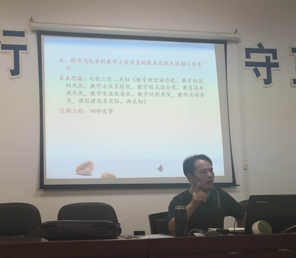 教学副院长梁建新教授做了题为《全面开创马克思主义学院本科教学工作新局面》的主题报告。报告首先结合上级文件精神分析了新时代本科教学工作的新要求,然后分析了马克思主义学院思想政治理论课教学所面临的四大矛盾,必须坚守的四条底线,并提出今后淘汰“水课”,打造“金课”的五大工程,基本思路以及具体措施,提出了“七化三实二关切”的整体方案,对思想政治理论课教学从课程考核,团队建设,教研教改等方面进行了制度设计。报告引起了全院老师的认真关注与激烈讨论。易显飞书记在总结中提出,马克思主义学院的思想政治理论课教学是立院之本,强院之基,学院各项工作都要围绕教书育人这个中心工作展开,不断提升马克思主义学院本科教学水平,不断开拓马克思主义学院教书育人新境界。