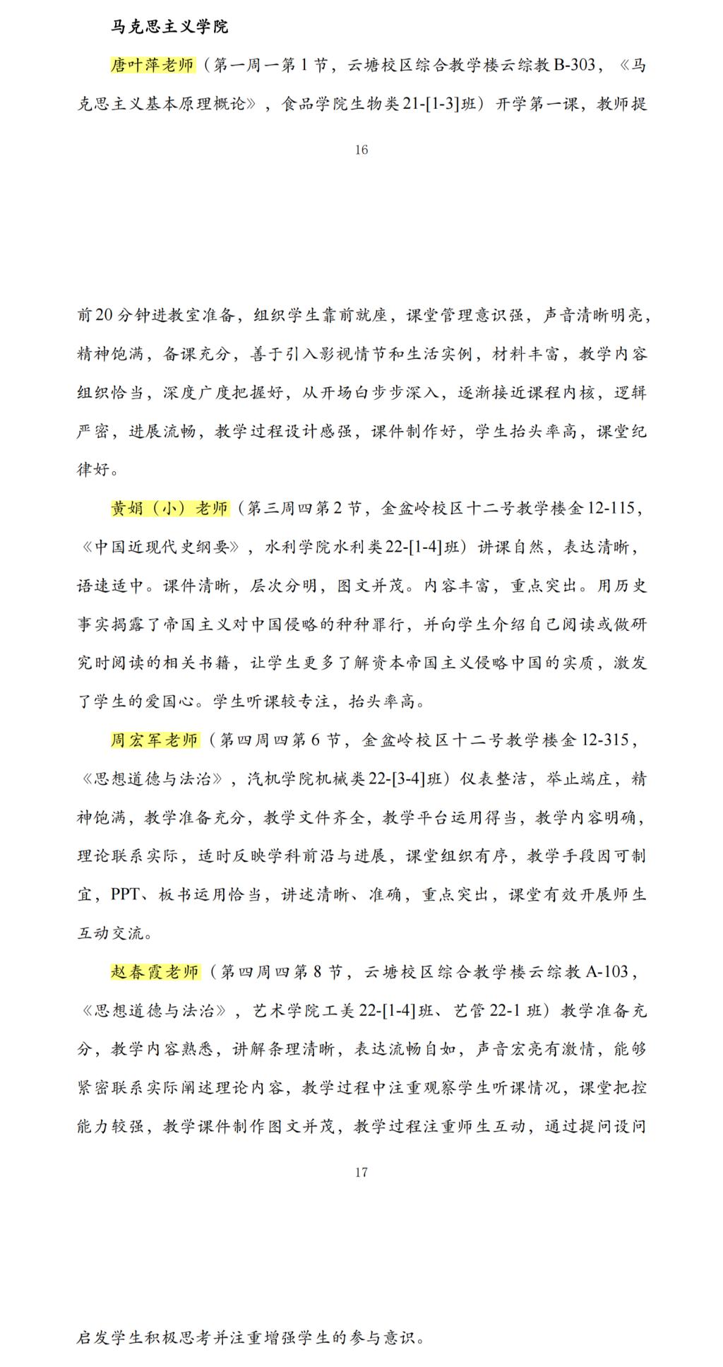 4月30日,开云kaiyun体育发布《本科教学督导信息》(23年第一期)简报。我院唐叶萍、黄娟(小)、周宏军、赵春霞、罗月婵、卿定文等六位教师获评开云kaiyun体育“课堂教学优秀典型”。