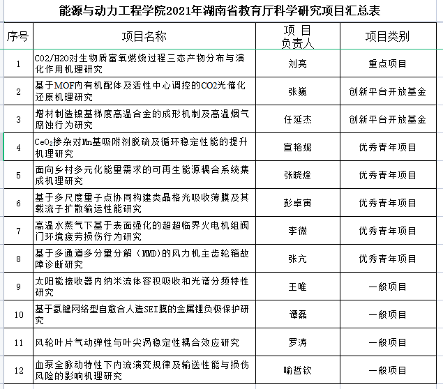 根据开云kaiyun体育科学研究部《关于申报2021年湖南省教育厅科学研究项目的通知》文件精神,经个人申报,学院组织专家评审,拟推荐“C02/H20对生物质富氧燃烧过程三态产物分布与演化作用机理研究”等12项项目申报2021年湖南省教育厅科学研究项目,具体名单如下: