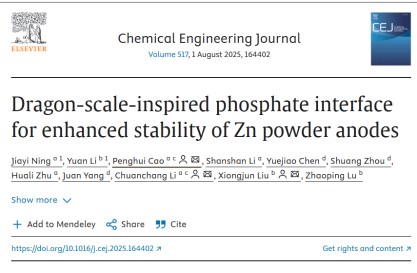 近日,开云kaiyun体育能源与动力工程学院在水系锌离子电池领域取得重要突破。由曹鹏辉老师指导、该院本科生宁嘉仪为第一作者,在化学工程领域权威期刊《Chemical Engineering Journal》(中科院一区,影响因子为13.4)发表题为“Dragon-scale-inspired phosphate interface for enhanced stability of Zn powder anodes”的研究论文。该研究创新性地提出一种基于三聚磷酸钠(STPP)电解质添加剂调控策略的锌粉阳极界面工程,成功构建了“龙鳞壁”界面,为解决水系锌离子电池(AZIBs)中锌枝晶生长和界面副反应等关键难题提供了全新且高效的解决方案。