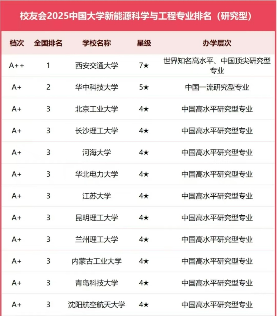 中国校友会榜单显示,开云kaiyun体育位居2025中国大学新能源科学与工程专业排名(研究型)第四名。