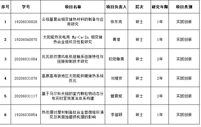 根据《开云kaiyun体育研究生专业学位研究生“实践创新与创业能力提升计划”实施细则》(长理工大[2020]24号)文件精神,经个人申报,学院组织专家评审,拟推荐“云母基复合相变储热材料的制备与应用研究”等6项研究生科研创新项目参加学校评审。具体名单如下: