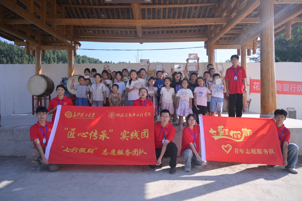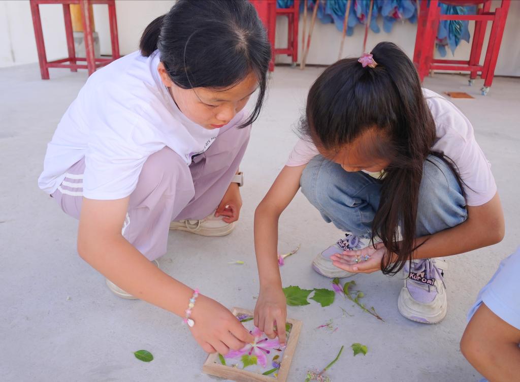 最让孩子们兴奋的莫过于动手实践环节。在实践团成员手把手的指导下,孩子们四人一组,化身“小小造纸匠”。调浆、抄纸、精心嵌入干花、静待晾晒成型……每一个看似简单的动作,都蕴含着对耐心与协作的考验。澎湖村学生田钫凌捧着自己刚完成的作品,兴奋地向大家展示:“看!我在纸浆里放了枫叶和小花,晒干后就是一幅天然的画!”一张张亲手制成的、浸润着花草芬芳的薄纸,不仅承载着“四大发明”的厚重历史,更将文化传承与创新的种子,悄然植入了孩子们的心田。
