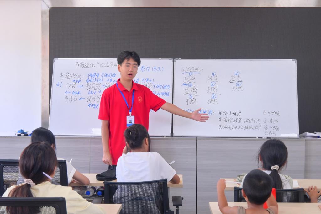 队员谈佳昊以“书的演变”开启知识大门,从镌刻在甲骨、青铜器上的古老文字,到承载于简牍、帛书的文明信息,再到便捷的现代电子书,他生动勾勒出人类记录与传播的壮阔画卷。随后,课堂聚焦中国古代四大发明之一的造纸术。谈佳昊借助清晰的流程示意图,将“切麻、蒸煮、舂捣、打浆、抄纸、干燥、揭纸”八大古法步骤一一拆解。孩子们听得入神,目光中闪烁着对先人智慧的惊叹。