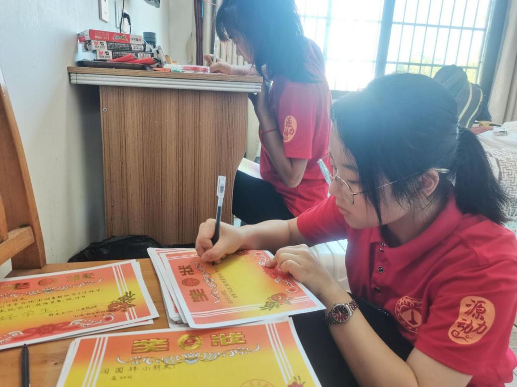 次日,澎湖队员们根据暑期科普教育的实际考察情况,精确到每位学生在暑期班的个人表现情况,针对不同学生的不同性格、不同特长为其书写奖状。每一个孩子都得到了红彤彤的奖状,每一张都饱含队员们对学生热爱与期盼。
