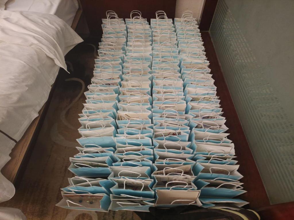 历经十小时车程,=澎湖队员们抵达了花垣县,并在第一时间就开始了回访礼物的分装工作。实用性强的油性笔与精致的笔记本,可口的糖果与暖心的寄语,一百份精美“礼盒”在澎湖队员的团结协作下分装而成。