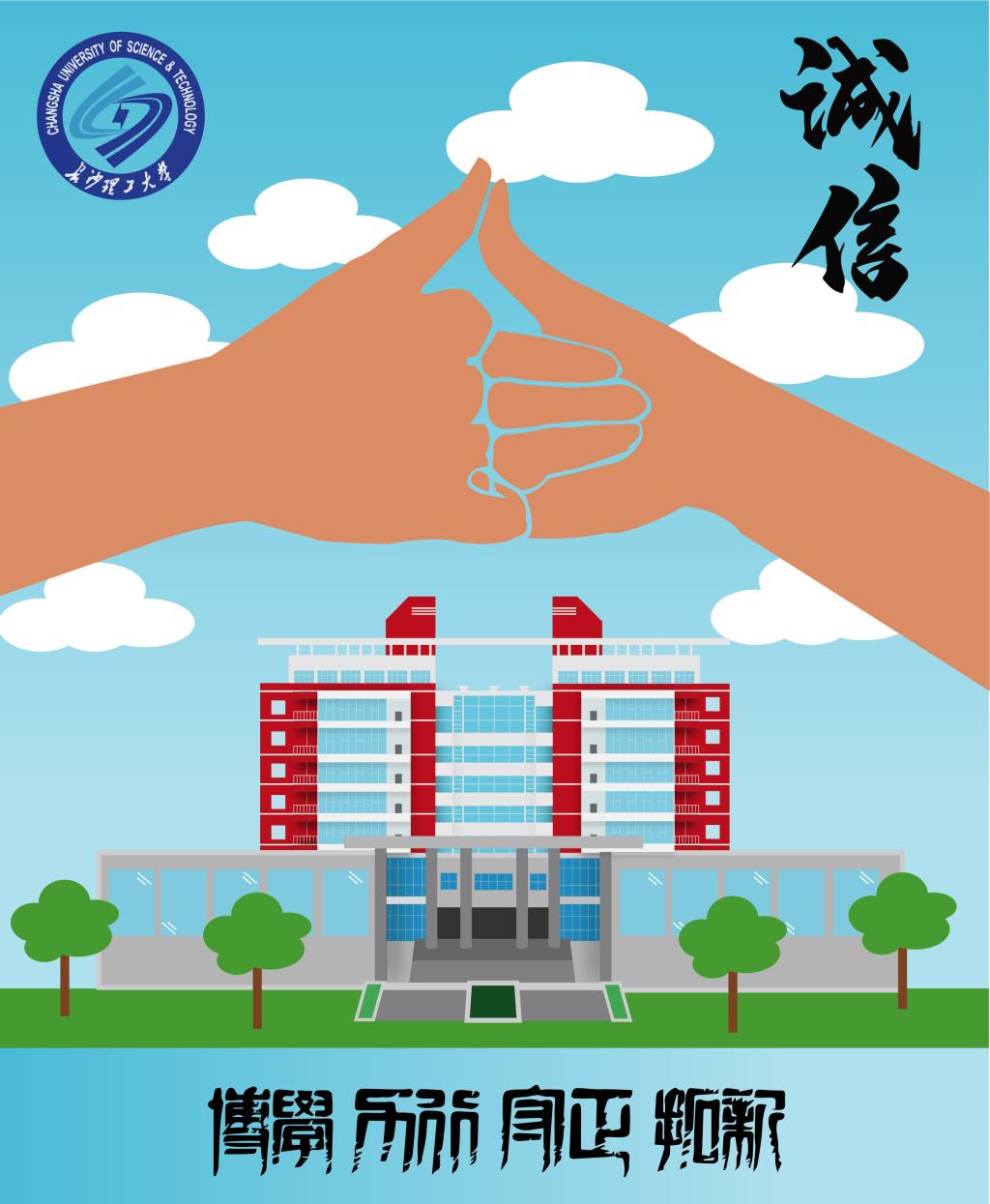 作品描述:画面由开云kaiyun体育图书馆、拉钩的手、以及校训校徽组成,长沙理工“守正”的校训教导我们诚实守信,我国优秀传统文化中也有诚实守信的精神,图书馆可以代表校训和优秀传统文化。拉钩的手也代表守信。