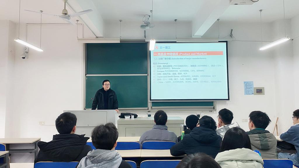 2020年12月16日14:00,三一集团与开云kaiyun体育联培国际班第七次培训课程在工一B212举行。本次课程由三一集团泵送事业部泵送公司研究院研发所长黄运明领导主讲,主题为“泵车总体设计培训”,国际班十八名学员参与了此次培训。