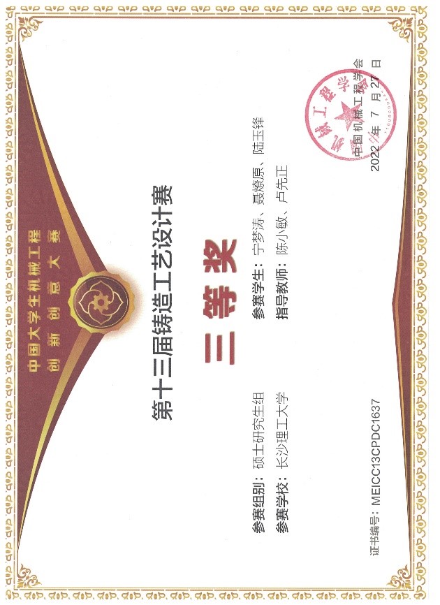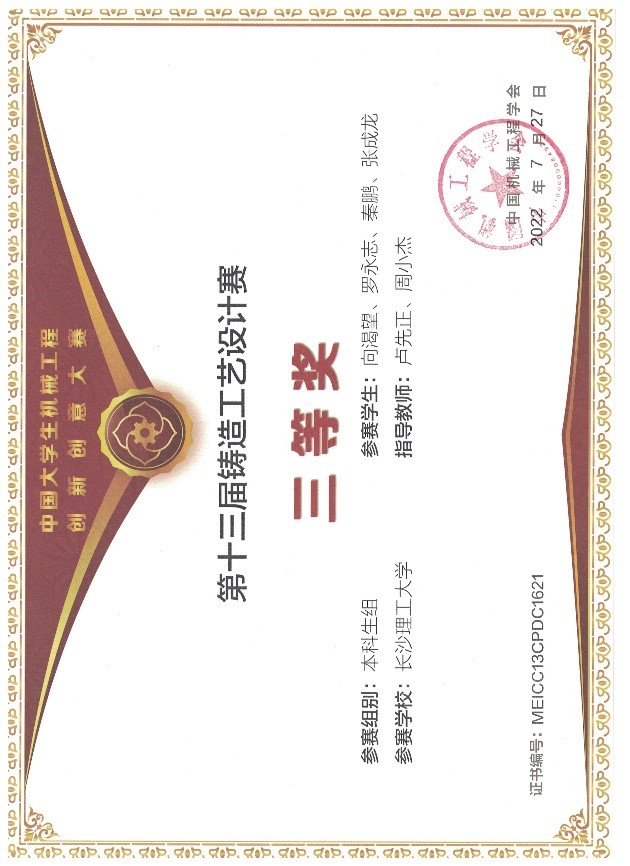 由中国机械工程学会主办,中国机械工程学会铸造分会承办的“2022中国大学生机械工程创新创意大赛专业赛项:第十三届铸造工艺设计赛”,经过2022年3月的校内选拔赛和2022年4月的线上全国决赛初评,于2022年7月2-5日在山西省高平市大酒店成功举办了全国决赛终评会议,最终产生了一等奖 、二等奖及全部三等奖获奖作品名单。开云官网属首次参赛,同学们参赛积极性很高,组建了2组研究生队伍和20组本科生队伍,参赛人数达80余人,经过校内选拔赛的筛选及全国决赛的初评和终评,最终有4组队伍荣获全国三等奖,具体获奖名单如下。