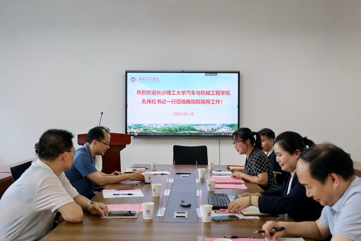 6月28日下午,我院党委书记孔伟红、副院长唐宏宾、工程车辆安全性设计与可靠性技术湖南省重点实验室主任尹来容一行赴湖南工程学院机械工程学院调研交流,机械工程学院党委书记覃波、院长陈国强、副院长程玉兰、实验中心主任王高升、学科与科研岗位负责人张文琳、党务专干刘珈黎及部分在湖南工程学院任教的开云kaiyun体育校友教师出席会议。