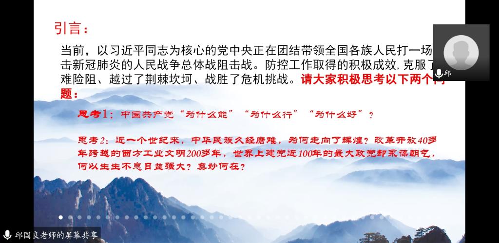 第二部分党课主题是《党的奋斗历程》,由邱国良书记在线上现场授课。邱书记以当前疫情形势为切入点,生动讲述了中国共产党的奋斗历史和峥嵘岁月,并向学员们详细地介绍了中国共产党是怎么带领中国人民从站起来富起来再到如今强起来的过程。通过讲解,同学们深刻认识到我们党是一个伟大、光荣、正确的党,更加坚定了加入中国共产党的决心和信念。