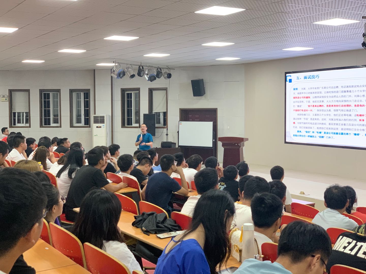 主讲人刘亚辉书记,结合自己多年的工作经验,引以实例和数据分析,从形势分析、择业观念、就业途径、简历制作、面试技巧等五个方面进行指导。