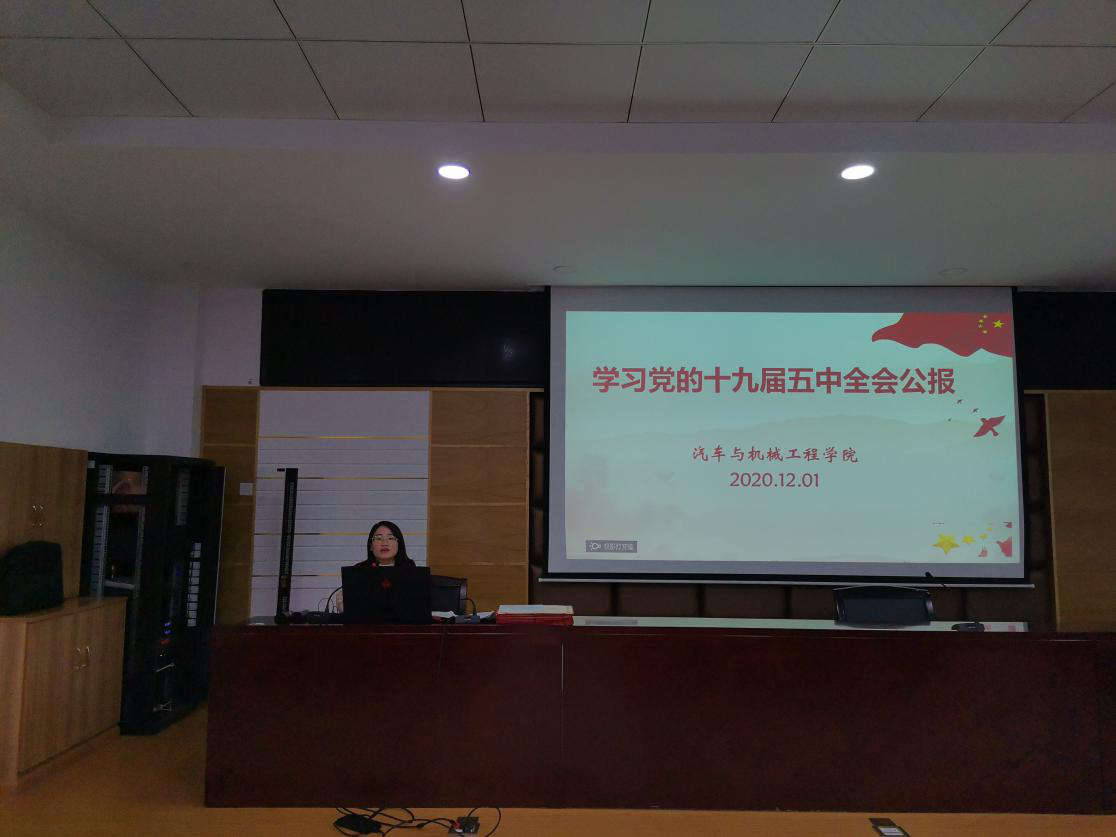 2020年12月1日晚,汽车与机械工程学院组织全体本科生党员在工科一号楼B417开展党的十九届五中全会精神学习。本次党课由学院学生党总支副书记王丽丽主讲,主题是《学习党的十九届五中全会公报》,120余名本科生党员参加学习。
