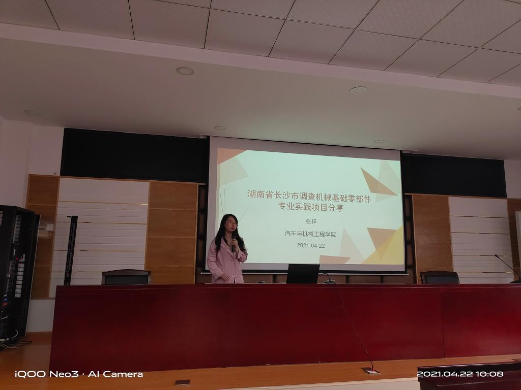 张梓作为汽机学院赴长沙市调查机械基础零部件的专业实践团队的负责人,首先向同学们讲述了填写项目申请书的注意事项,要描述清楚课题申请的目的意义、核心内容、解决的问题以及具体实施方案等,并提醒大家前期准备工作,一定要做好与企业相关负责人的联系对接以避免出现意外情况。然后张梓介绍了前往湖南申亿机械应用研究院以及株洲齿轮厂的所见所闻,实践团队共分为五个小组:策划组、摄影记录组、技术组、新闻报道组以及后勤组,团队成员协同配合,各司其职,共同推进实践活动的进行。随后她讲述了活动后期实践报告书写、视频制作等资料整合的方法和技巧,并告诉大家一切均要结合个人真实体验来展开,不能偏题,最终方可得出相关的专业结论和心得体会。张梓最后为大家讲解了当时结项答辩的情况,并告诫同学们,在成果展示时,要抓住细节,追求精益求精。