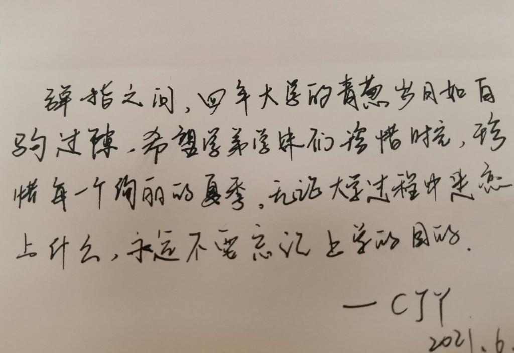 活动中,毕业生党员们真诚地为学弟学妹们写下心里话,也积极为学校提出宝贵意见。“好好锻炼身体,珍惜美好的校园时光,让青春不留遗憾,愿长理早日实现百强梦,愿汽机学院越来越好”、“为国铸剑,我们先将自己百炼成钢,祝学弟学妹学业有成,一切顺利”、“努力终有汇报,你一定能成为想成为的人”,这一段段发自肺腑的祝愿,表达了他们对学弟学妹真诚的祝福与对母校的留恋。大家在离开这充满生机的美丽校园时,为母校留下一份温馨的记忆。