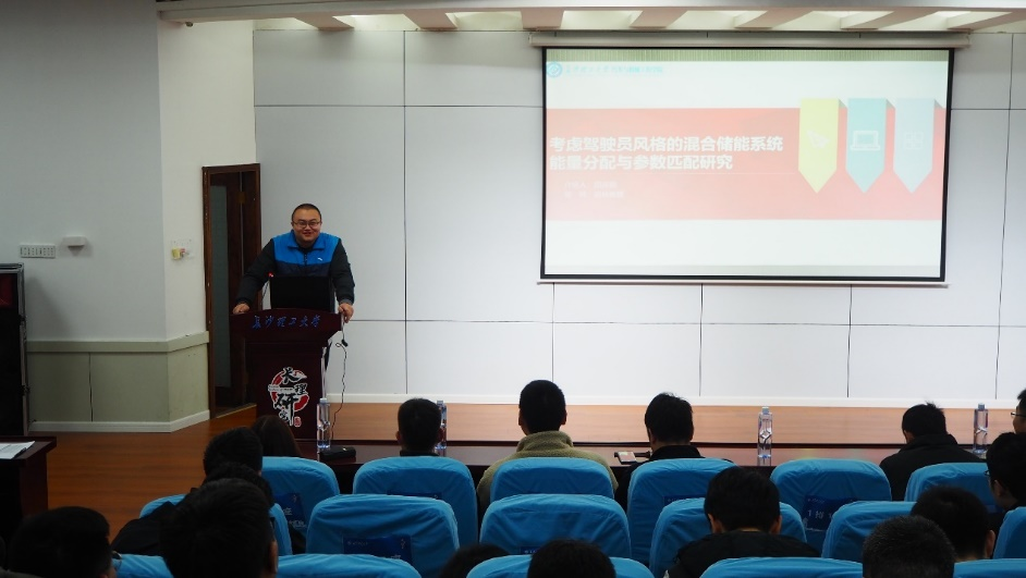 谭丽莎主要研究方向是机电液控制、液压节能,负责主持湖南省研究生科研创新项目《工程装备液压势能再生系统的设计与效能研究》。首先简单的介绍了项目的研究背景,然后详细的讲解了项目过程中的设计建模、实验和结果分析,以她自身的切实经历与研一同学分享交流。刘建武的省级科研创新项目为《混凝土泵车臂架末端轨迹规划及避障算法研究》,他指出在项目之初,需对所研究项目进行大量的背景调查,对所存在的问题进行针对性的探索。在交流的过程中,也简要的介绍了他目前的项目的相关进程和研究内容与技术路线。田庆韬主要研究方向为电动汽车混合储能管理系统研究,负责主持研究生省级创新项目《考虑驾驶员风格的混合储能系统能量分配与参数匹配研究》。他指出混合系统的能量分配简而言之就是将电机的需求能量或者制动回收的能量合理的分配给超级电容和电池。除了对创新科研项目进行了具体分析,还分享了宝贵的经验与建议,他强调在选择方向时需提前和导师进行交流,并且可以结合自己的爱好;在日常学习中,记录自己的灵感,多阅读论文,尽早为项目撰写做好准备。