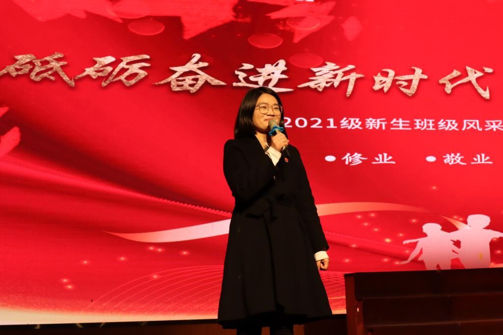 表演结束后,彭琼英老师致辞,彭琼英老师首先向参与表演的全体同学、台前幕后的工作人员表示感谢,也对各个班级班委在班级建设中做出的努力表示赞许和欣慰。她希望在今后的班集体建设过程中能够更进一步发展班集体思想、增强集体观念、团结同学;班级干部更要在学习生活中起到引领的作用,成为成长引领的基层组织。