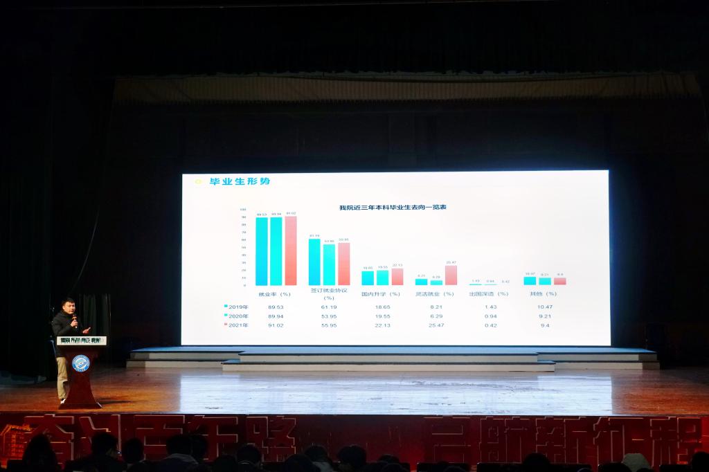 学工办蔡翔羽老师从毕业生数据为大家解读了考研和就业现状,引导大家树立客观的就业理念,未来的就业最主要的还是要依靠自己的能力,在校生要不断的强化自身,从学习能力和综合能力等方面展现出风采。
