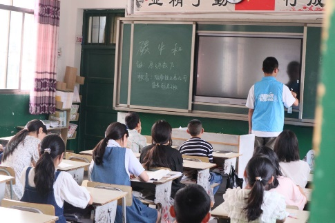 当天的课程依然精彩纷呈,队长贺君豪秉承“芙蓉学子-乡村振兴”项目的宗旨,在教授完大班课程后,又为初中的同学们讲述了环保核能的知识。此外,在队友们的精心准备下,该团队继续为同学们带来了精彩的音乐、舞蹈、英语、篆刻等课程。