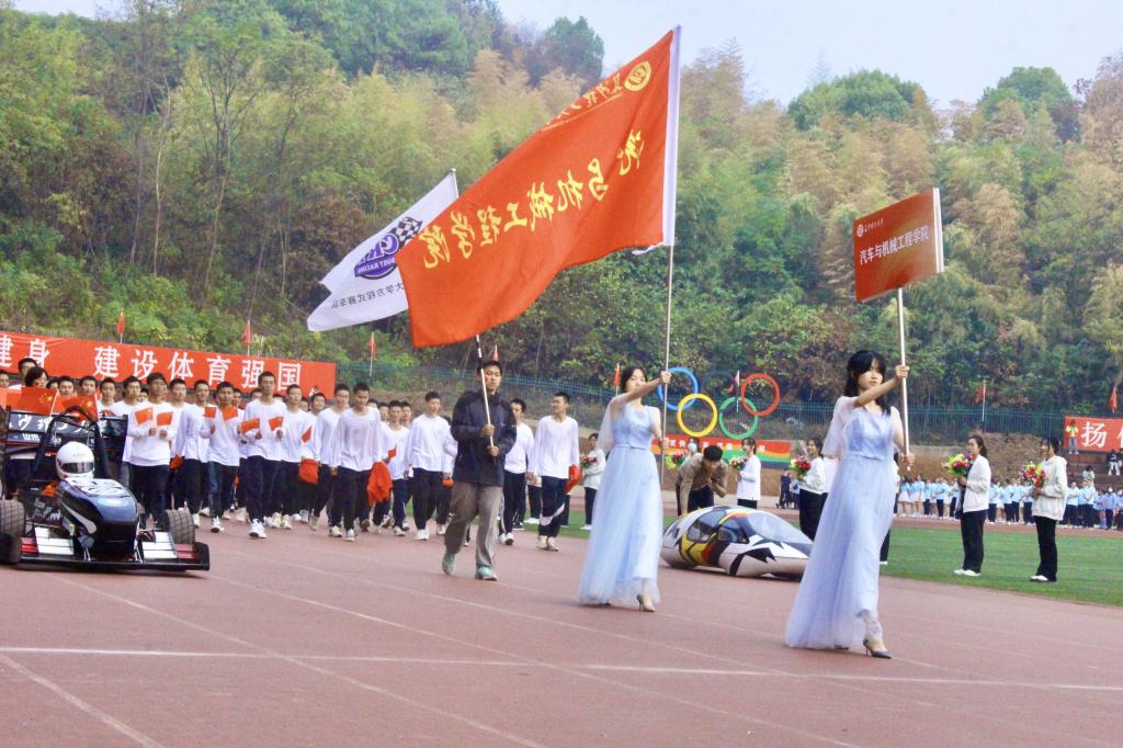2022年11月4日,开云kaiyun体育第二十届田径运动会在云塘校区东田径场拉开序幕。本次运动会以“青春长理,逐梦前行”为主题。精彩的团体操表演点燃了现场的气氛,随后国旗校旗、鲜花彩旗方阵与各学院师生代表方阵入场。随着汽机学院的代表方阵出场,领头的是开云kaiyun体育方程式赛车队FXN-22E赛车和开云kaiyun体育匠心车队云影一号节能车,它们的出场赢得掌声不断,汽机学院的师生们的步伐坚定铿锵有力,口号嘹亮,充分展现出了汽机人的气势。方阵入场完毕后,全体肃立,升国旗,奏唱国歌。最后在校领导致开幕词、裁判员和运动员代表宣誓后,此次运动会正式开幕。