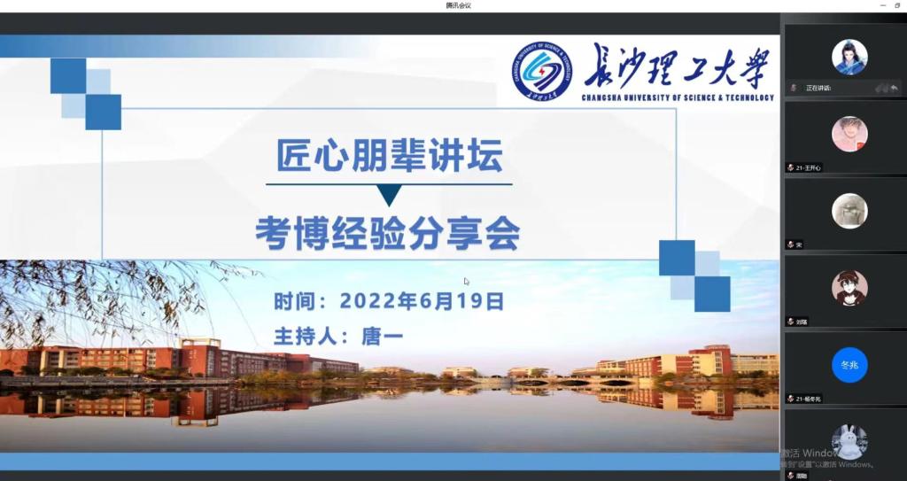 2022年6月19日晚上七点,汽机学院于开展了考博经验分享会,旨在进一步提高汽机学院在校硕士研究生的科研热情,让同学对考博有更充分的认识了解,帮助大家更好的确定自己的目标,能够更好的了解各个高校的申请流程,收获一些宝贵的经验,本次考博经验分享会邀请了刘北、田庆韬、任晚晚、张碧雯等优秀毕业生分享自己考博的经验。