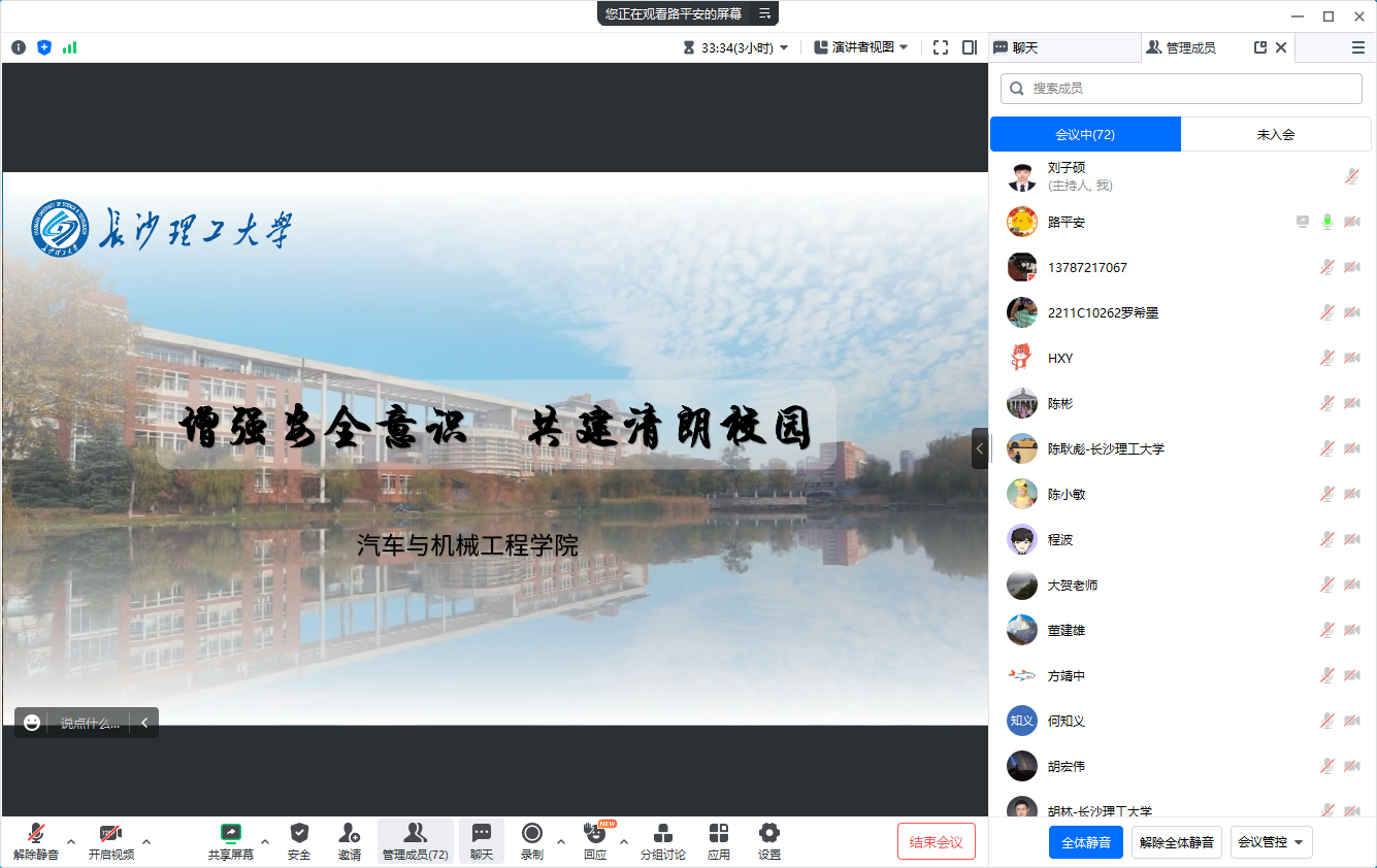 后续,各班级、研究生课题组将召开校园安全专题班会、组会,传达本次会议精神。以切实提高广大师生的交通安全出行规则意识、法治意识和文明意识,坚决筑牢校园安全防线,真正做到人人讲安全,事事为安全,时时想安全,处处要安全。