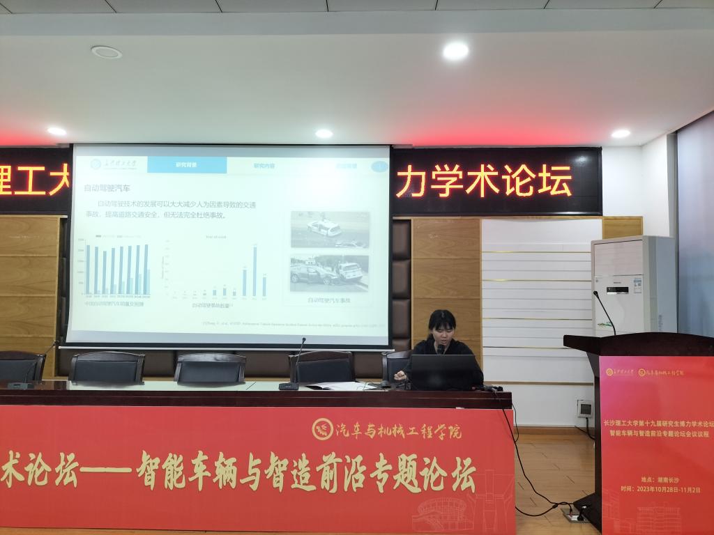在优秀论文交流会中,汤康杰、刘晶等22名研究生就研究背景、研究内容和研究结论作了题为《Inverse Identification on friction coefficient of 2A10 aluminum alloy bars under electromagnetic impact loading》和《自动驾驶汽车队列行驶下多车事故中驾驶员损伤风险研究》等22项报告。