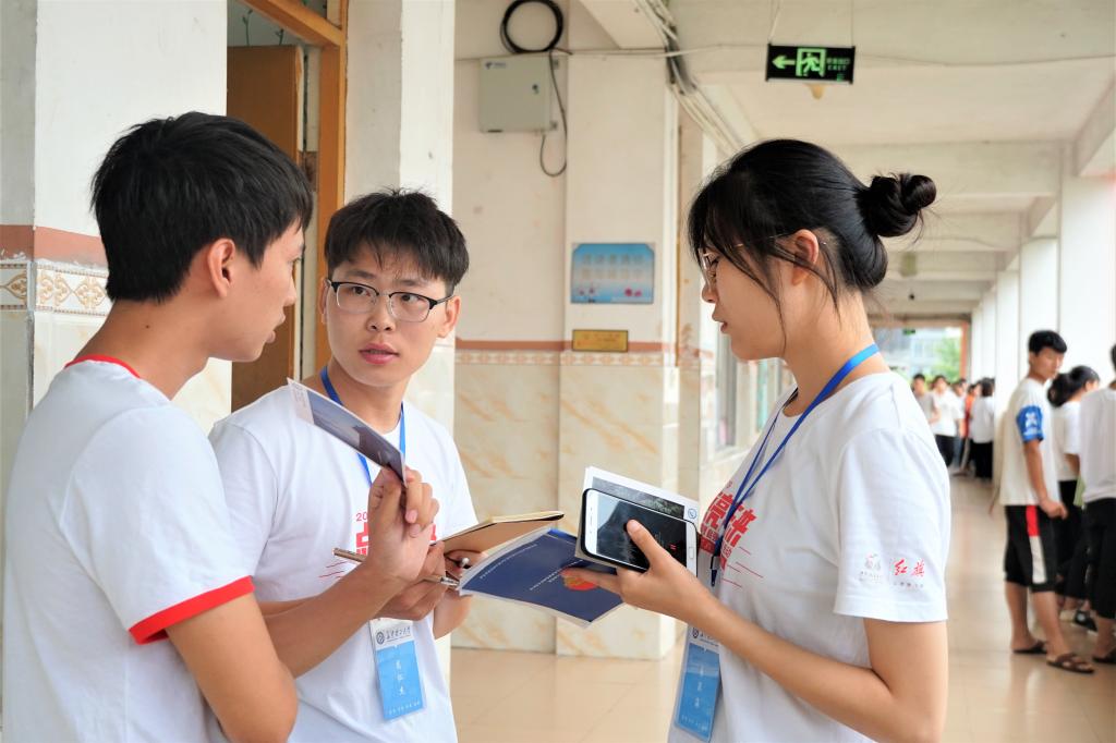 8月4日上午9点,支教队一行11人准时到达凤山县高级中学。在该校韦春莹老师的指引下,大家参观了校内的基础设施和宣传栏,对该校基本情况有了更多的了解。为了更加了解学生们的家庭情况、学习状况以及未来规划,队员们利用课间休息时间,对少数准高三同学进行了简单调研。通过调研,队员们了解到:许多同学有非常强烈的走出大山的愿望,但是学习动力不足,学习成绩不佳,大部分同学都对自身缺乏认知、对未来缺少规划。