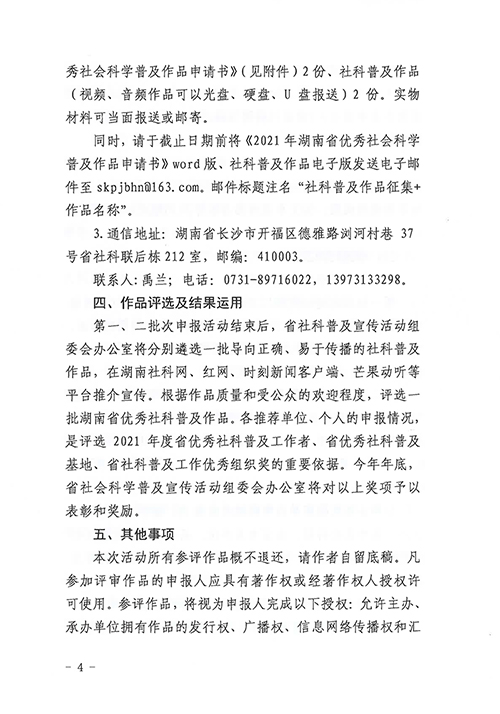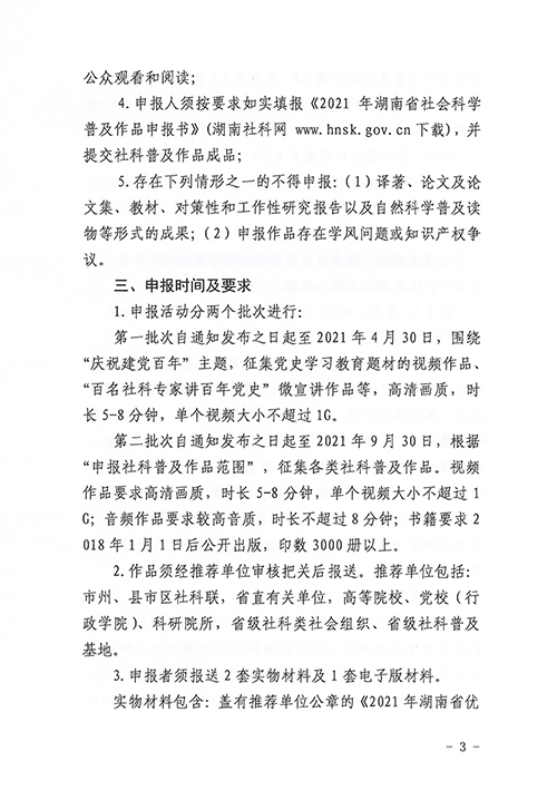 2021年湖南省优秀社会科学普及作品申报分两批,请申报的老师按照通知要求和学校时间节点(第一批为4月27日,第二批为9月27日)将实物材料送至社科处711室,并发邮箱:1430893250@qq.com,由学校统一报送至省社科联。联系人:陈娅,联系电话:85258994。