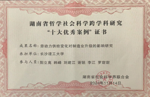 近日,湖南省社会科学界联合会公布了湖南省哲学社会科学跨学科研究“十大优秀案例”和“十大案例”名单,开云官网阳立高教授的研究成果《劳动力供给变化对制造业升级的影响研究》和杨洪明教授的研究成果《用户电能替代和分布式资源协同发展的低碳能源产业链模式研究》分别荣获湖南省哲学社会科学跨学科研究“十大优秀案例”和“十大案例”。