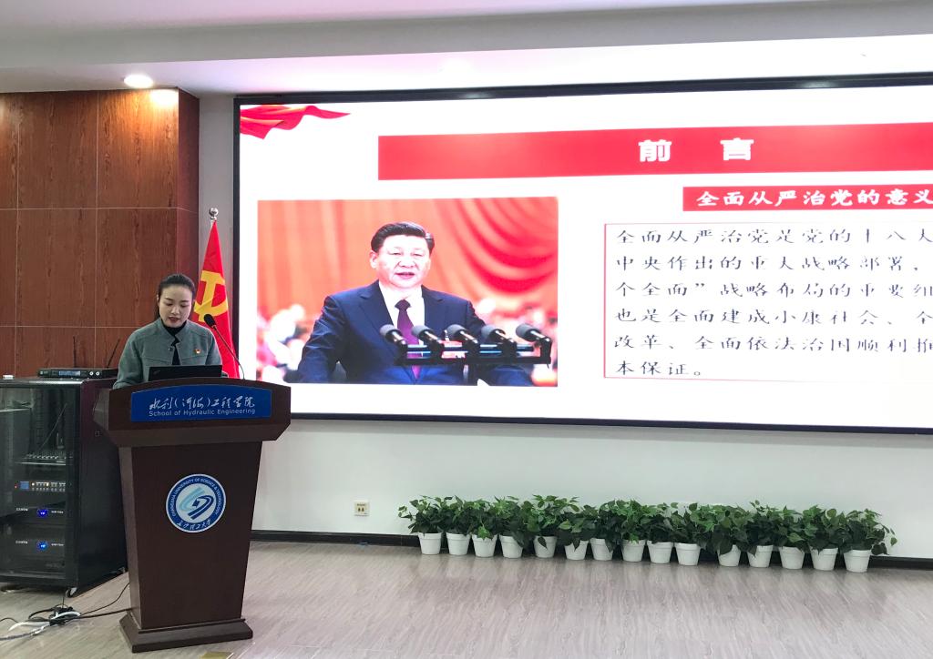 4月2日下午,水利工程学院院党委书记喻玲娜在工三B319为全院教职工讲授了“坚定不移推进全面从严治党”专题党课。