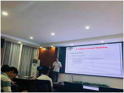 报告开始前,胡世雄简要介绍了吴长山的教育背景及科研经历。吴长山以全球气候变化、洪水灾害及城市扩张问题展开。首先,介绍了当前全球气候变化的情况,同时提及到城市洪水灾害问题亟待解决,由于城市扩张导致下垫面硬化,改变了产汇流过程,造成诸多城市洪水问题。然后,他依次介绍了气候模型、城市扩张模型以及水文模型,对当前最新的研究成果进行了总结。最后,吴长山汇报了团队近期开展的研究工作,就湖底地形提取、城市洪水实时监测、预报,以及海狸最适宜生存环境的研究,与诸多老师及同学展开了讨论及进一步答疑。