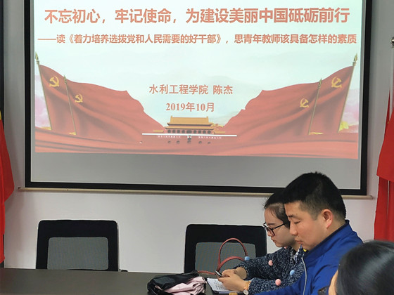 10月29日下午,水利工程学院副院长陈杰在工三B446为给排水科学与工程系党支部党员进行主题教育专题授课,主讲内容为:不忘初心、牢记使命,为建设美丽中国砥砺前行——读《着力培养选拔党和人民需要的好干部》,思青年教师该具备怎样的素质。给排水党支部全体党员参加了此次主题教育集中理论学习。
