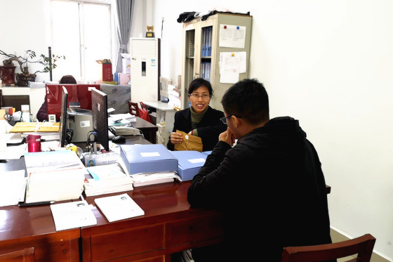 “肖老师,今天研究生论文的外审出来了,江某某的论文盲审没有通过,我找他谈过了,还需要辅导员关心一下,这是他的一些情况。”11月20日下午,水利工程学院科研与研究生办公室主任刘范红老师认真地和研究生辅导员肖苹宁老师讨论该如何教育辅导研究生江某某,并把《水利工程学院“三全育人”记录表》转给肖老师。