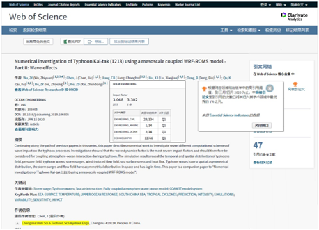 2、Zhiyuan Wu, Jie Chen*, Changbo Jiang, et al. Numerical investigation of Typhoon Kai-tak (1213) using a mesoscale coupled WRF-ROMS model — Part Ⅱ: wave effects [J]. Ocean Engineering, 2020, 196, 106805.(JCR Q1分区期刊)