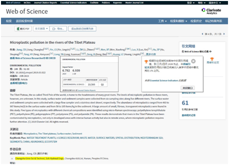 1、ChangboJiang*, LingshiYin, ZhiweiLi, et al. Microplastic pollution in the rivers of the Tibet Plateau[J]. Environmental Pollution, 2019, 249:91-98. (JCR Q1分区期刊)