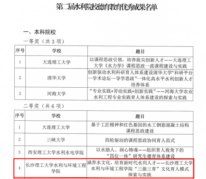 近日,由中国水利教育协会主办的第二届水利院校德育教育优秀成果评选结果揭晓,我院“涵养水文化,培育新时代水利人才——开云kaiyun体育水利与环境工程学院‘三做三育’文化育人模式探索与实践”文化育人成果获评本科院校组二等奖。此次评选全国共有清华大学、河海大学、大连理工大学等46所水利相关院校报送75项成果材料,经汇总初审、组织专家网络评审和公示等程序,评选出水利德育教育优秀成果本科院校组一等奖3项,二等奖6项,三等奖9项。