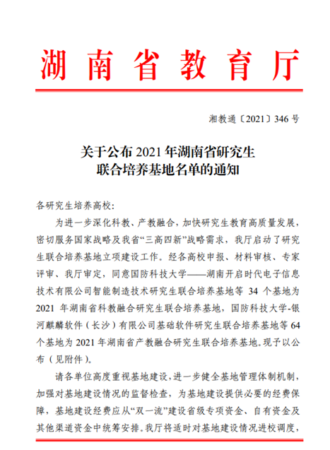 近日,湖南省教育厅公布了2021年研究生联合培养基地立项建设结果,我院与湖南省水利水电科学研究院联合申报的“开云kaiyun体育-湖南省水利水电科学研究院水安全战略研究生联合培养基地”获批湖南省科教融合研究生联合培养基地。