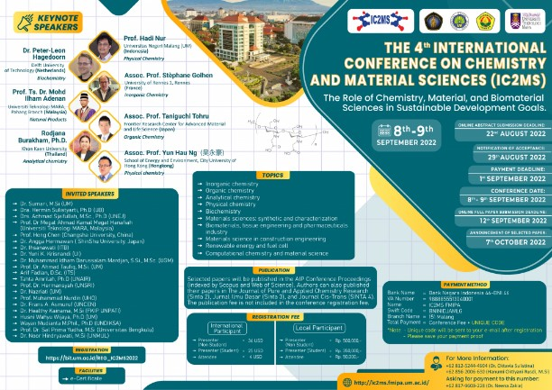 2022年9月8~9日,水利与环境工程学院陈宏教授课题组在线参加了国际会议The 4th International Coference on Chemistry and Material Sciences(IC2MS)。第四届IC2MS在印度尼西亚举行,旨在探究化学,材料和生物技术在可持续发展目标中的作用。会议由Universitas Negeri Malang(玛琅国立大学)承办,共有来自印度尼西亚、马来西亚、日本、中国等多个国家的上千名科学家和学者同行及研究生参加。