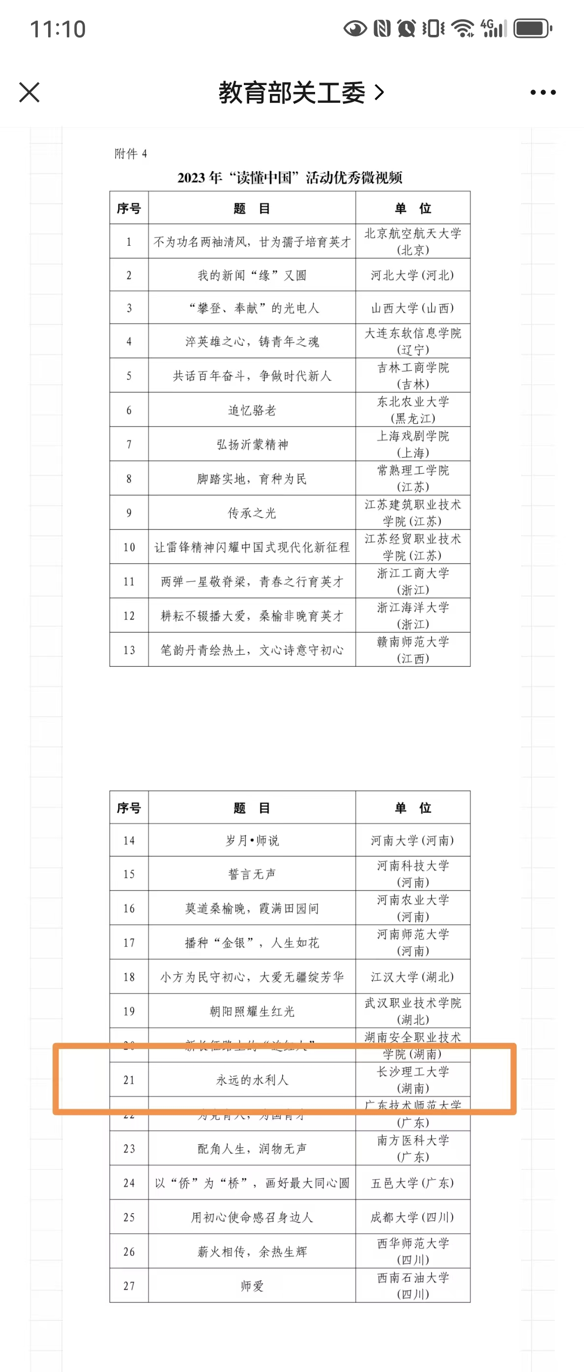 教育部关工委开展的2023年“读懂中国”活动中,水利学院选送的作品《永远的水利人》荣获教育部关工委优秀微视频、省教育厅关工委微视频特等奖。