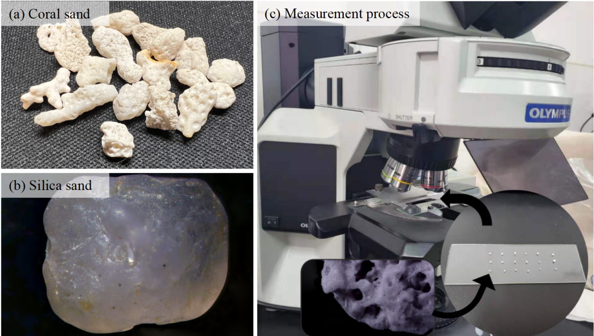 图 1 通过显微镜观察珊瑚砂颗粒与石英砂颗粒的不同